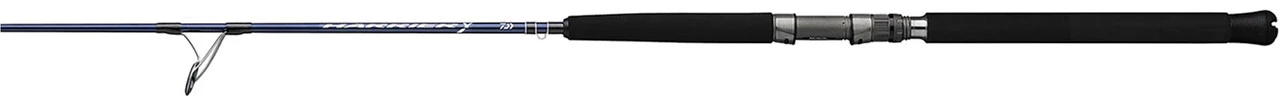Exceptionally well built and highly versatile, the Daiwa Harrier X Jigging Spinning Rods are an excellent addition to any saltwater angler’s arsenal regardless of what coast they fish on. These multi-purpose rods excel in all forms of jigging and bottom fishing. Whether you are deploying newer techniques like flutter and knife-type jigs, bouncing bucktails or diamond jigs off the bottom, or sticking to the classic “weight and bait” techniques of bottom fishing, the Harrier X Series has the perfect rod for your application. Built on blanks constructed from Daiwa’s High Volume Fiber (HVF) carbon technology, the Harrier X achieves the superior strength and rigidity needed for coastal applications while keeping the blank thin and lightweight for comfortable fishing. Also outfitted with Daiwa’s X45 Technology, these rods are designed using a 45 degree bias construction that prevents ovalization and twisting of the blank for greater hoop strength under heavy loads. Anglers can expect the appropriate rod to load up nice and evenly for efficient fish fighting, whether its on a Northeastern fluke, a Baja bluefin tuna, or anything in between. All models are fitted with Fuji Tangle-Free K-Guides with Alconite Rings for favorable line management and a Fuji Back Stop Reel Seat that won’t loosen during regular use. Sturdy EVA grips provide a sure, comfortable hold on your rod while remaining easy to clean and hold up well over time. If you’re looking for the perfect jigging rod to cover multiple different techniques in your respective fishery, the Daiwa Harrier X should be towards the top of your list.